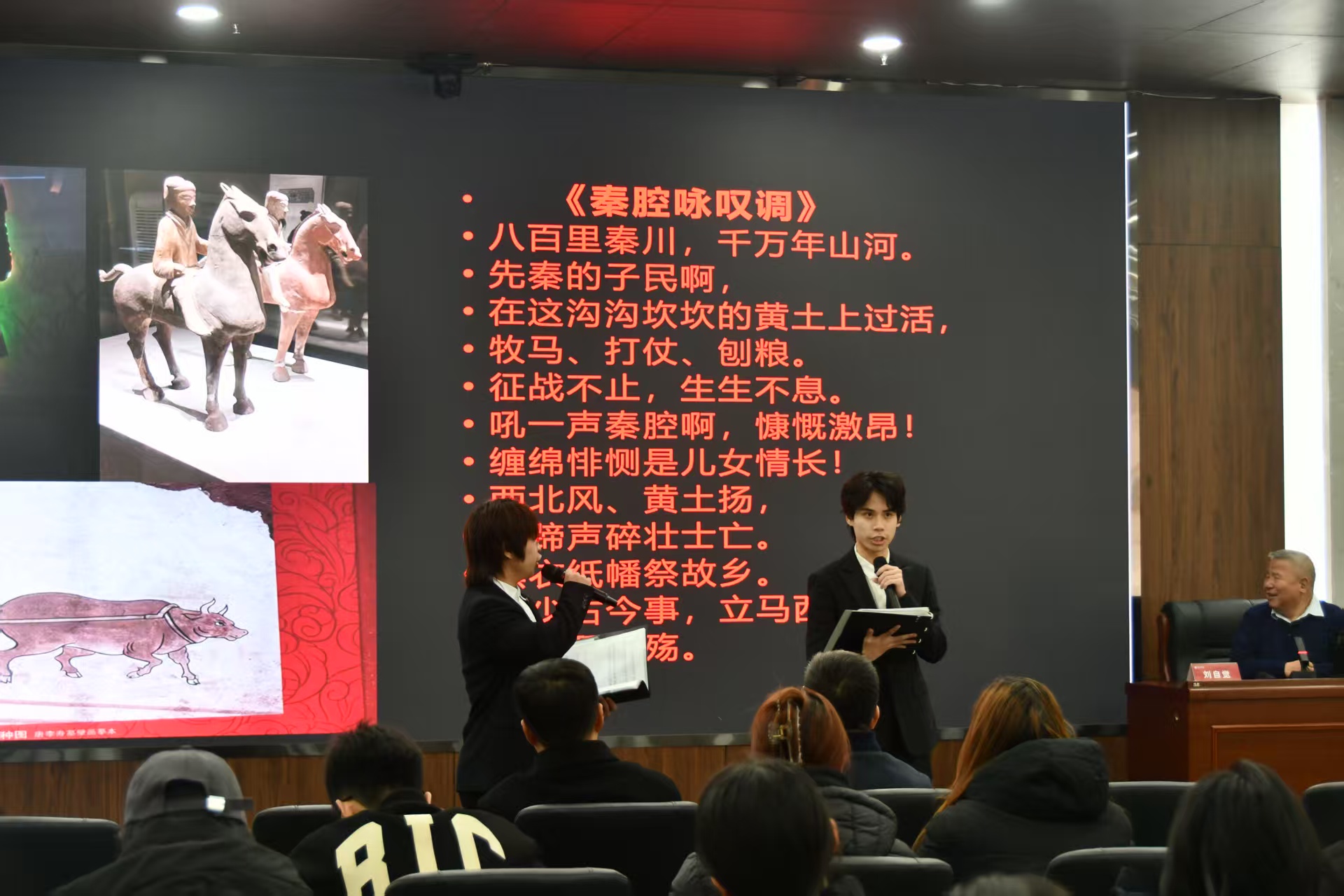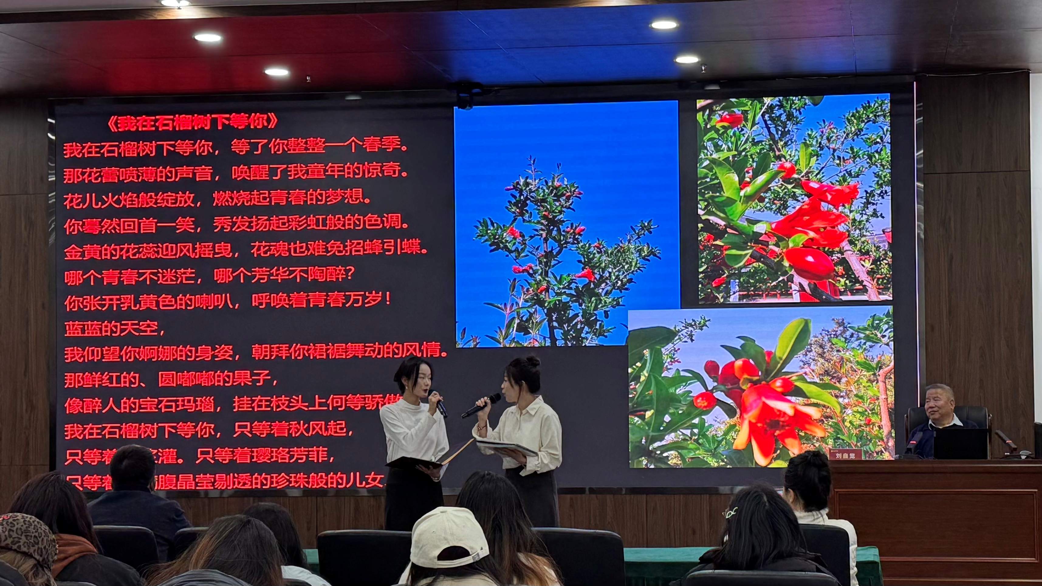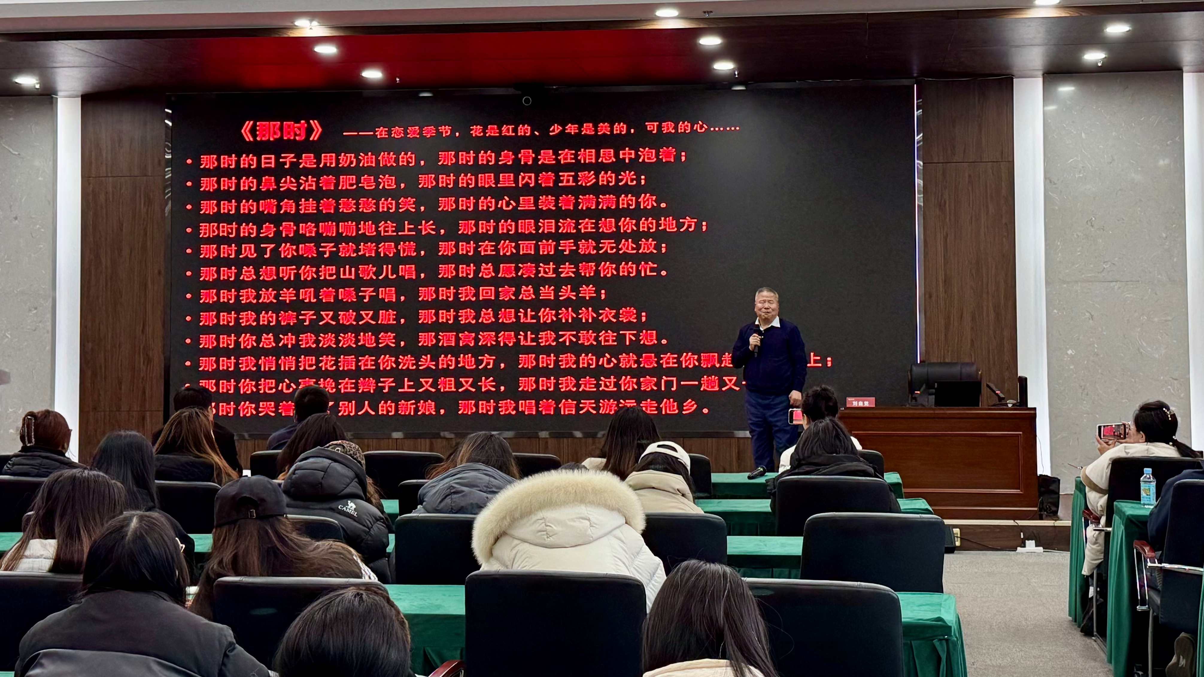 讲座中,刘自觉教授以个人创作经历为脉络,将学术解读与作品赏析深度融合,系统阐释不同时期诗作的文化内核与情感肌理,为师生搭建起“诗”与“乐”的对话桥梁。在作品分享环节,《秦腔咏叹调》以童年音乐记忆为底色,生动勾勒西北人民的生活图景,经艺术系学生深情朗诵,将地域文化的厚重感传递至现场每一位听众;《我在石榴树下等你》等青年时期佳作,借学生朗诵的细腻表达,让青春情愫与生活温度跃然眼前。