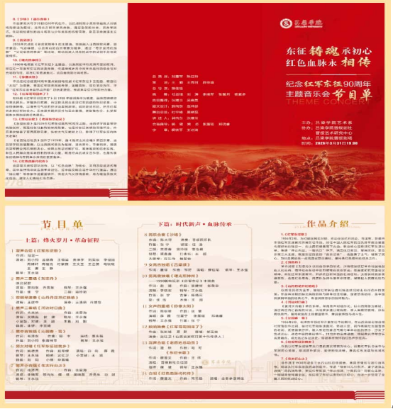 为纪念红军东征90周年,重温峥嵘岁月,缅怀革命先烈,赓续红色血脉,弘扬吕梁精神,传承晋绥文化,吕梁学院艺术系联合晋绥剧社、晋绥艺术研究中心,特举办“东征铸魂承初心 红色血脉永相传”纪念红军东征90周年专题思政音乐会。让我们一同在《红军东征歌》的激昂旋律中回溯历史,在《吕梁颂》的深情吟唱中感受吕梁精神,在《红色血脉代代传》的时代强音中坚定初心!诚邀全校师生共赴这场红色音乐盛宴,在旋律中回溯历史,在歌声中传承精神!