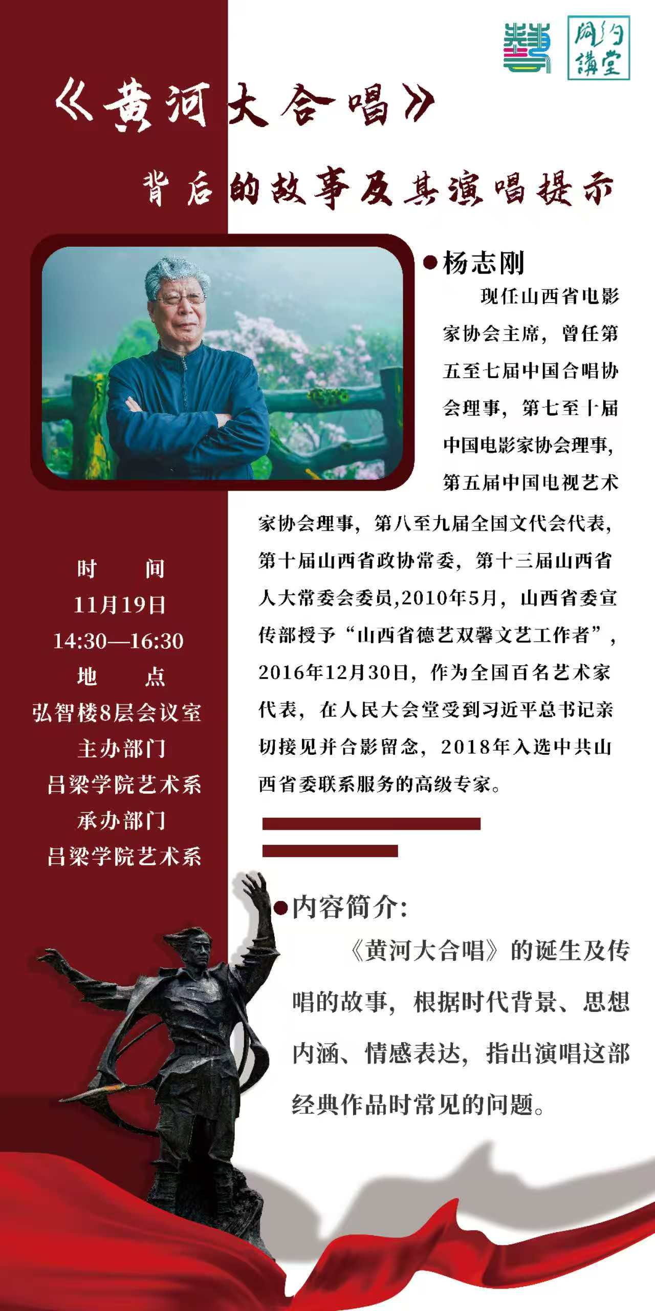 为深化艺术系师生对经典红色合唱作品的理解,破解演唱实践中的核心难题,11月19日14:30-16:30,我系在弘智楼8层会议室开展“ 《黄河大合唱》背后的故事及其演唱提示”专题讲座,艺术系领导、师生共计120人参与,讲座全程气氛活泼,收获满满。