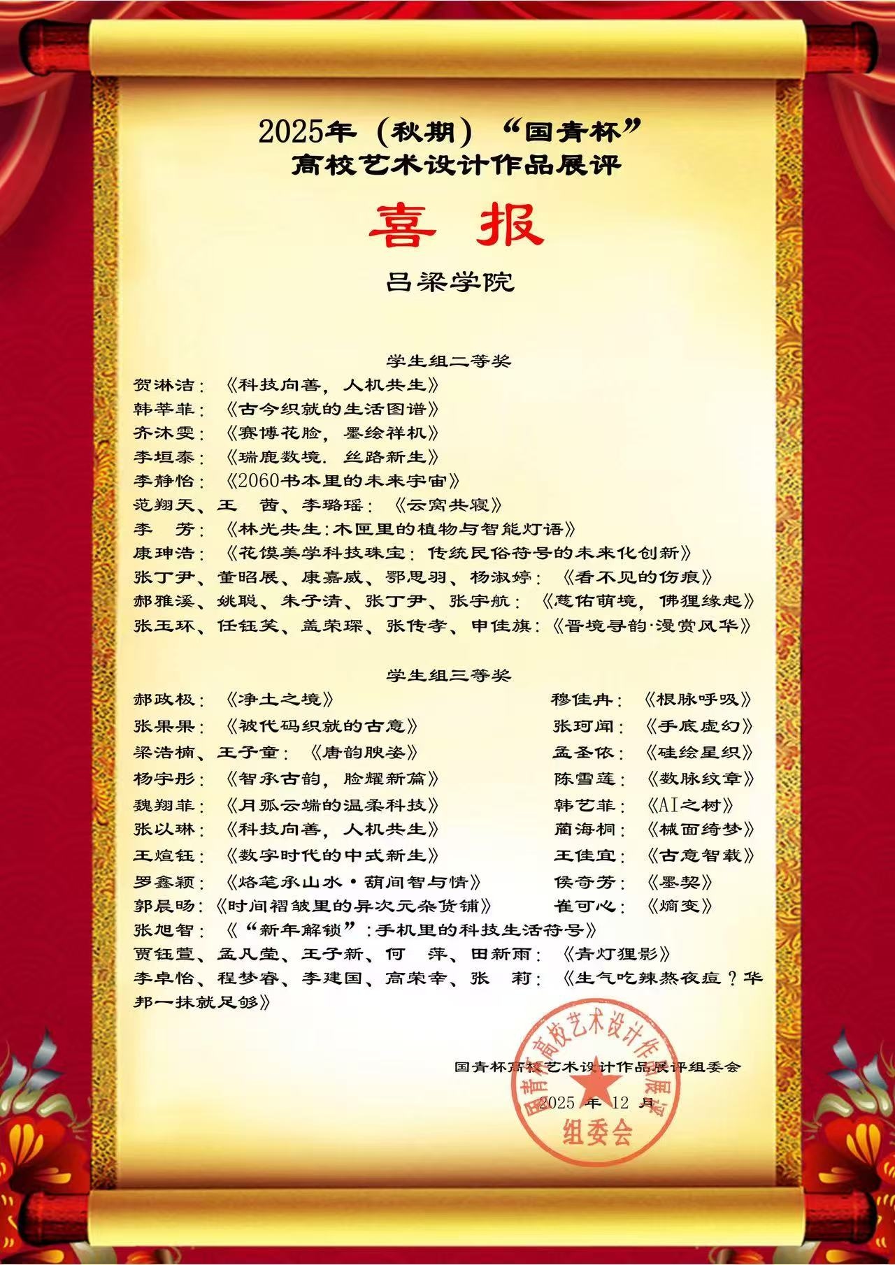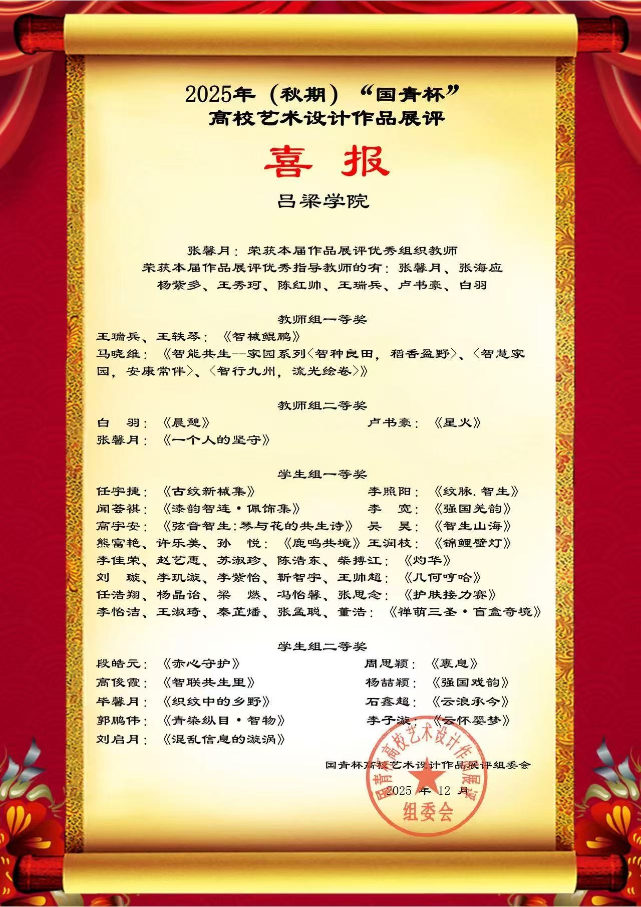 近日,2025年“国青杯”高校艺术设计作品展评结果揭晓,我系师生凭借紧扣“智能·共生”主题的优秀作品,在全国参赛队伍中脱颖而出,斩获多个奖项,艺术系的教学成果与师生创作实力再度得到彰显。