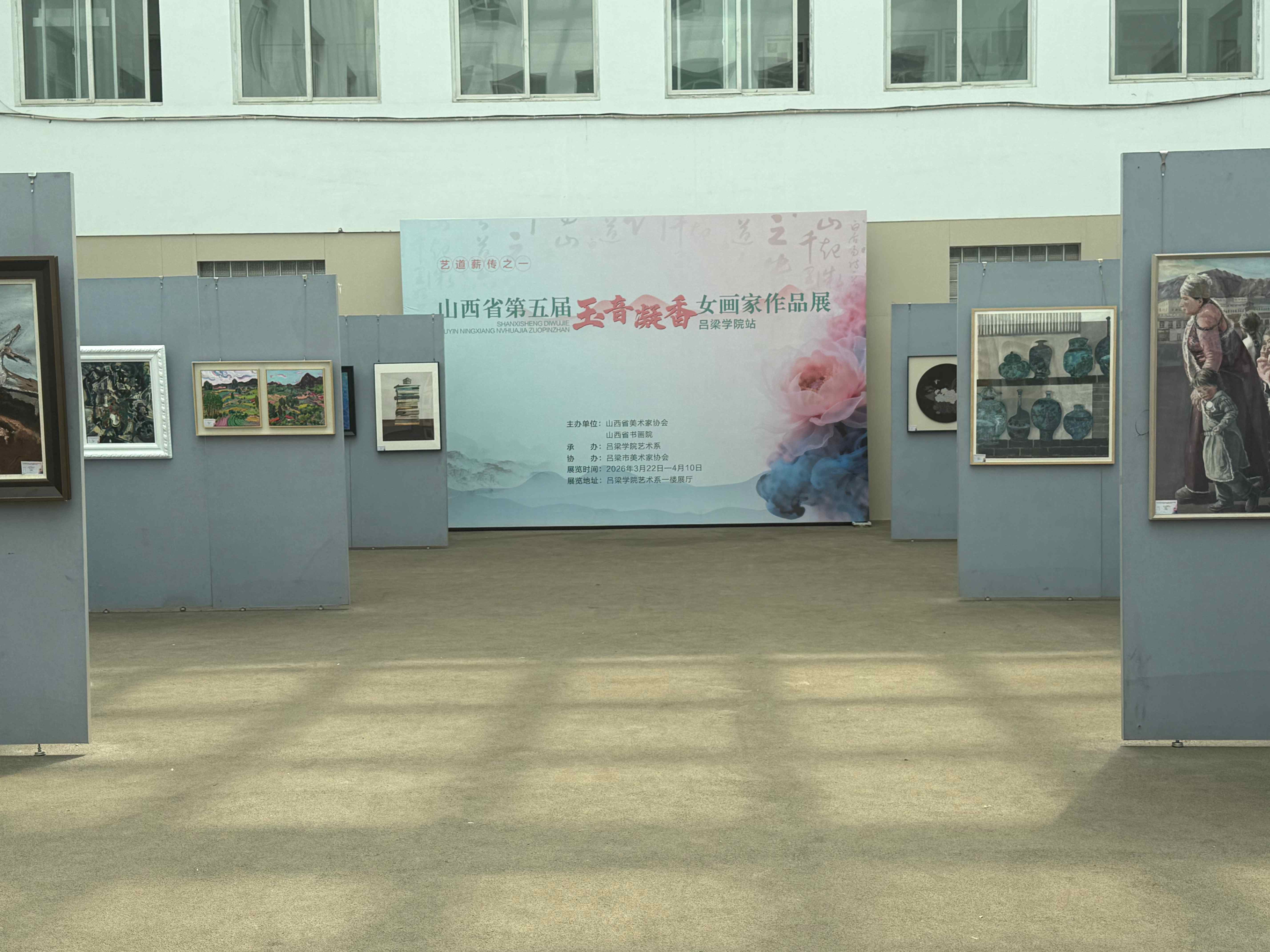 3月28日,由山西省美术家协会、山西省书画院主办的山西省第五届“玉音凝香”女画家作品展走进吕梁学院,在弘博楼艺术系展厅展出。